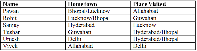 Pawan, Rohit, Sanjay, Tushar, Umesh and Vivek are 6 friends who belong to 6 different cities among Allahabad, Hyderabad, Delhi, Lucknow, Guwahati and Bhopal, not necessarily in the same order. During their summer break they decided to visit some other city. Each one of them went to one of the cities from the above list. No two friends visited the same city. Further, the following information is also known