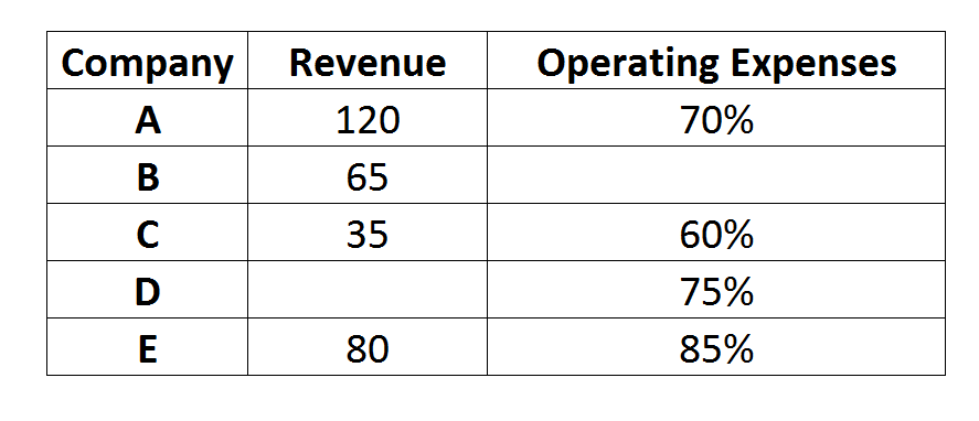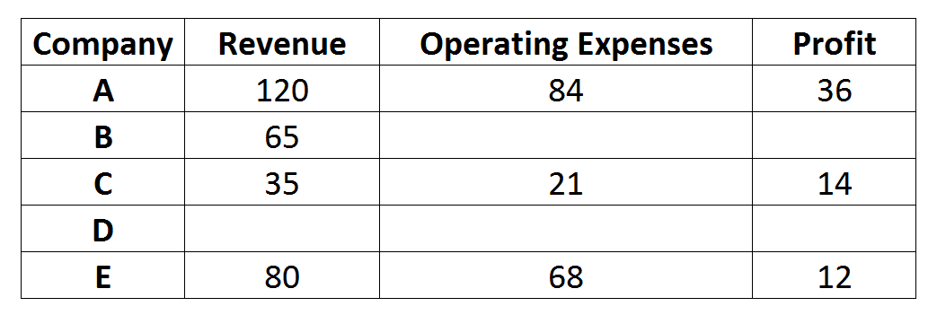 The revenue and the operating expenses as a percentage of revenue of five companies - A, B, C, D and E is given in the following table. (The revenue is given in crores)