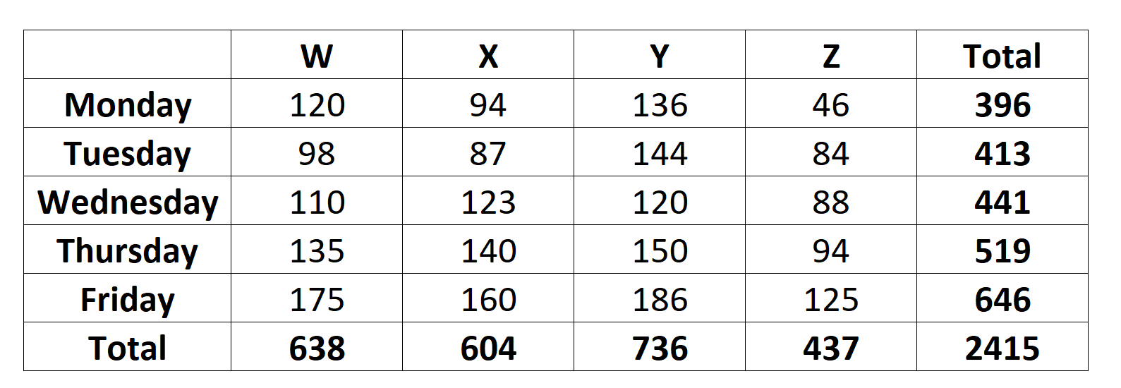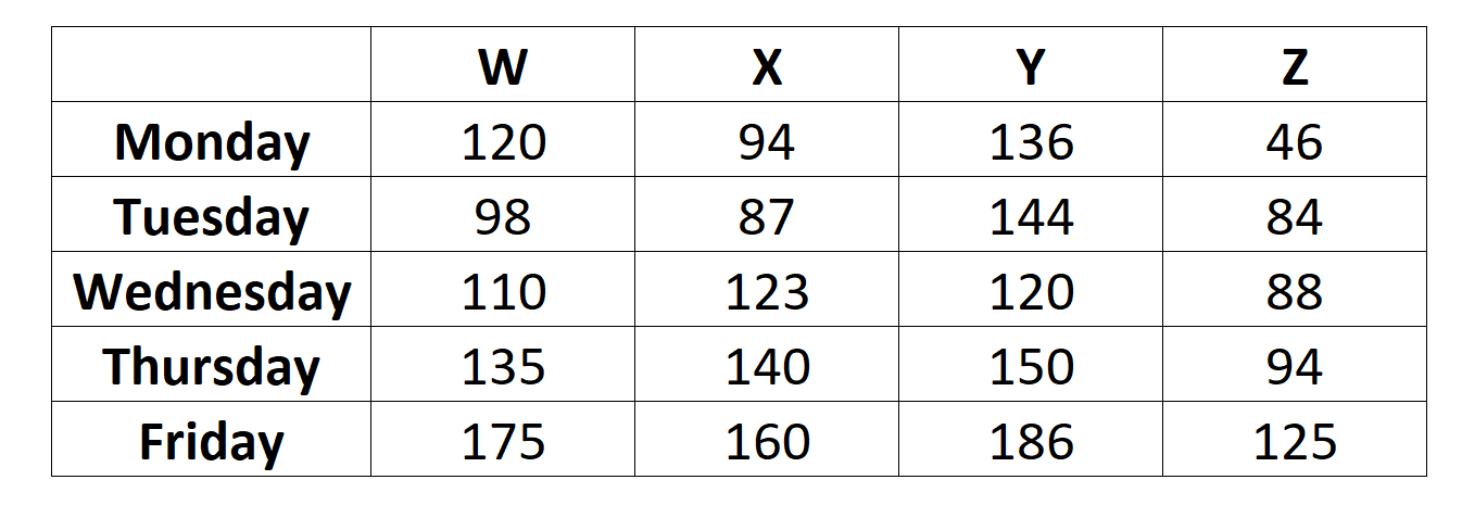A Movie theatre, J cinemas, screens four movies - W, X, Y and Z. The following table gives the data about the number of viewers of each movie for five days of a particular week.