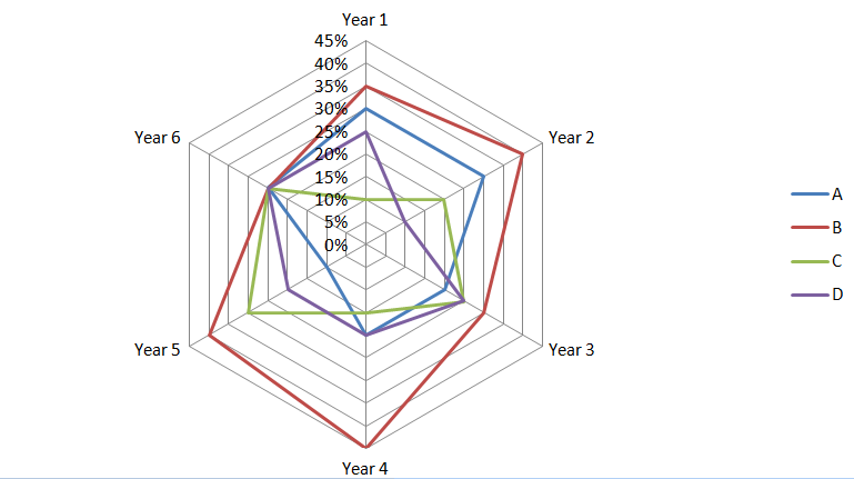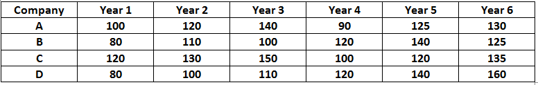 The following graph shows the market share of the companies - A, B, C, D in a particular segment from year 1 to year 6 by volume. The table shows the price per unit sold by all 4 companies from Year 1 to Year 6.