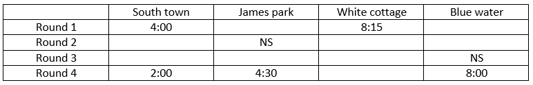 A bus service runs through a city such that the path of the bus is circular in shape and bus travels at the same speed. A bus starts from the stop 'South town' and covers three other stops - James park, White cottage and Blue water, before coming back to the stop 'South town' (which is one round) and continues again. A bus may or may not stop at a particular stop. The duration for which bus may stop is 1 hour. The table below gives the departure time of bus from some stops. The stations on which the bus doesn’t stop is marked with ‘NS’. For all other time, the bus stops at a particular stop. One round of the bus takes less than 10 hours.